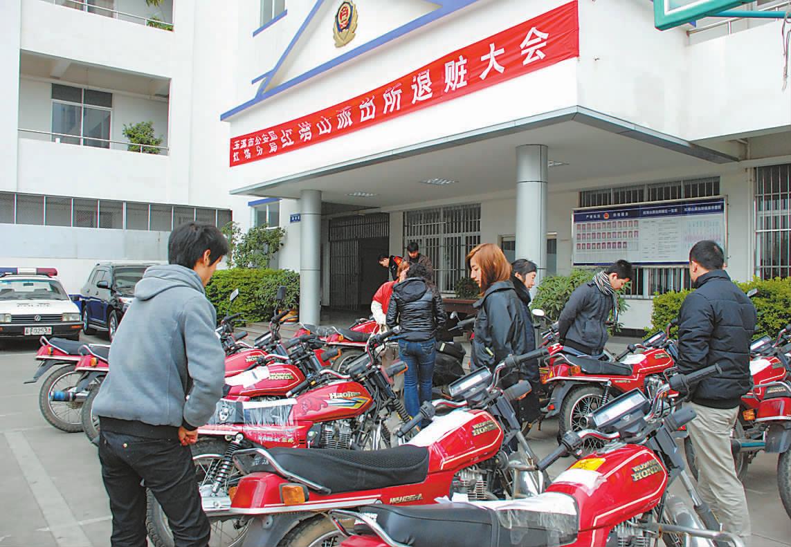 1月10日下午,市公安局红塔分局红塔山派出所举行退赃大会,将缴获且核实车主的17辆被盗摩托车退还给车主。