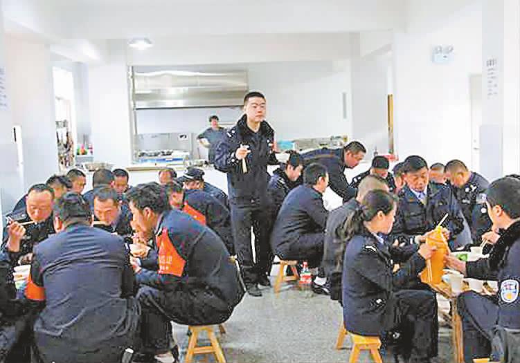 18时,年夜饭快出锅了!过年了,食堂师傅给值班的民警准备了丰盛的晚餐。做饭的师傅名字叫家喜,名字和人都很喜庆,人见人爱。年夜饭开吃了,大家坐在一起有说有笑。工作多年,和同事在一起的时间远远超过了和家人在一起的时间,大家相互理解、相互支持,像家人一样。一杯橙汁,几句寒暄,浓浓的情意,深深的祝福!