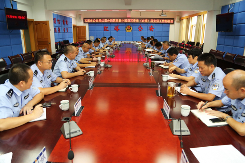 第四届中国聂耳音乐(合唱)周大型文化系列活动将于2015年7月17日至21日在红塔区举办。为确保活动期间社会治安大局的持续稳定,积极杜绝各类突发性案(事)件的发生,7月15日,分局组织各科所队主要负责人召开第四届中国聂耳音乐(合唱)周安保工作部署会。分局党委委员、副局长主持会议并就音乐周安保工作进行了安排与部署,同时进一步明确了各部门、派出所的职责任务;分局党委副书记、政委溥恩武参加会议并就如何开展好此次音乐周安保工作提出了具体的意见与要求。