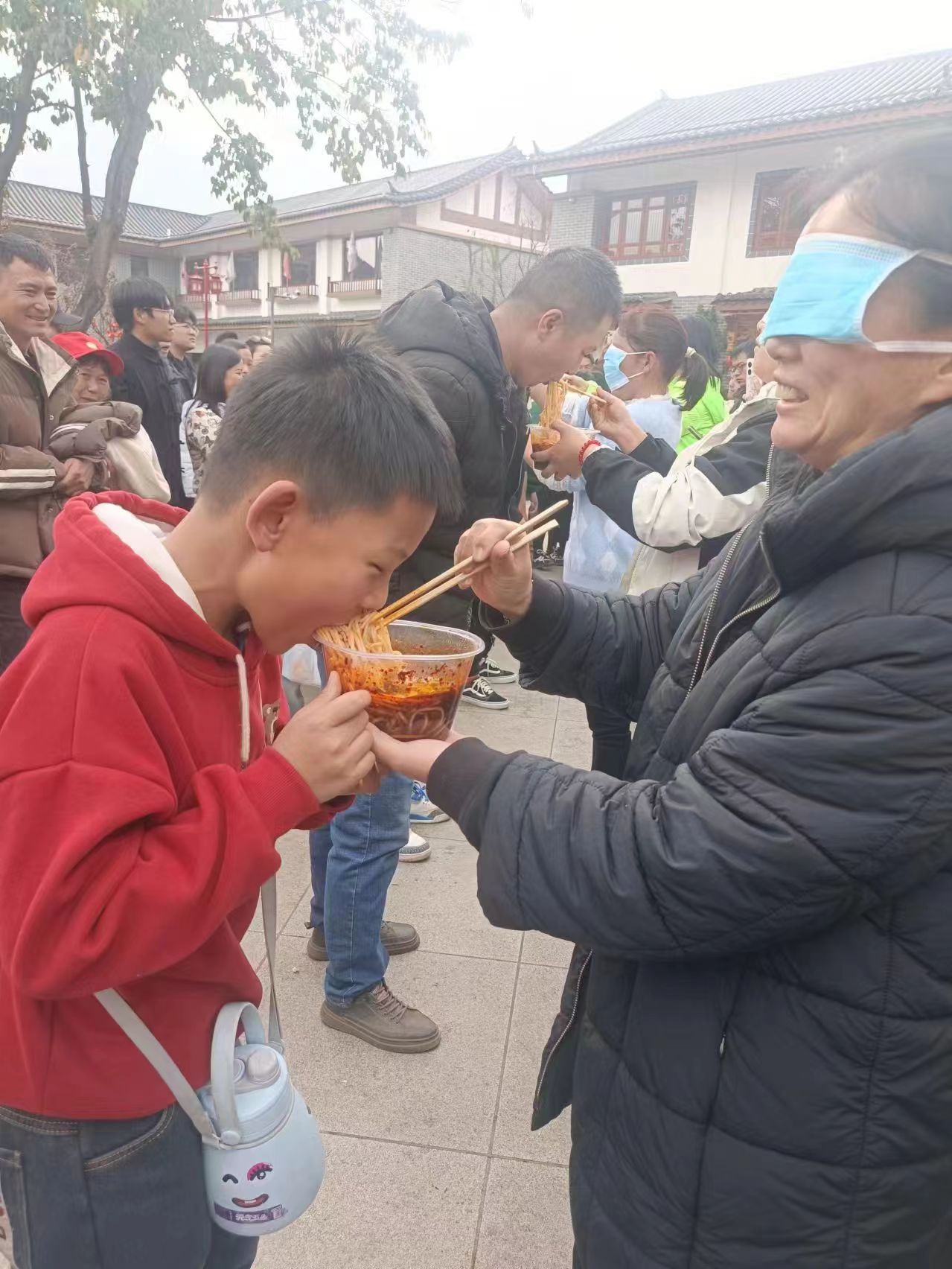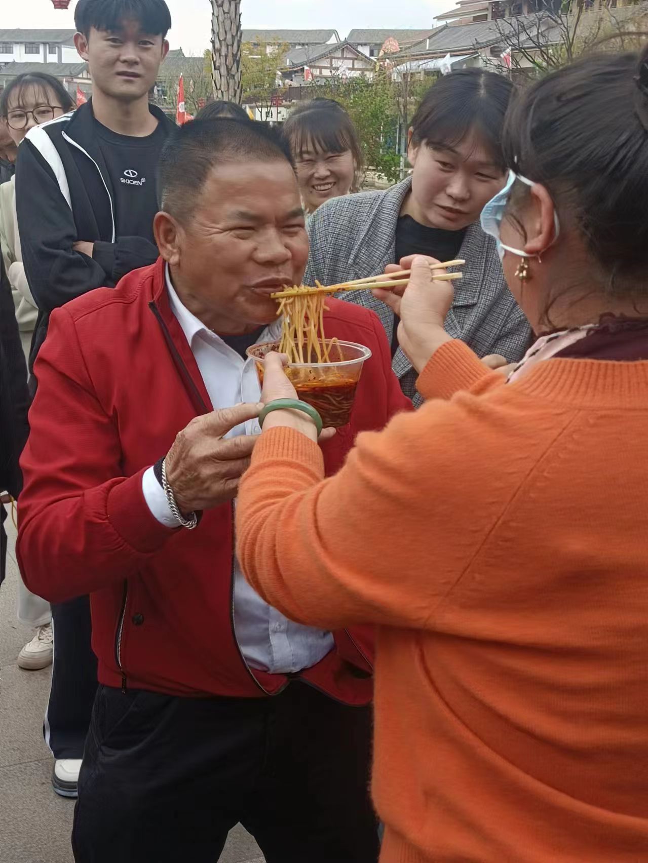 为增加节日的趣味性和娱乐性,丰富游客的感受和体验,2月10日、12日下午,分别举行了一场别开生面的“米线狂欢”——甩米线比赛。比赛规则简单而刺激,每对选手中,一人需蒙上眼睛,另一人则需用最快的速度喂食,最先吃完一碗米线的选手组合将获得胜利。这既是一场充满趣味和挑战的美食竞技活动,同时也展示了大营街米线美食文化的魅力,增强游客之间的互动与交流。