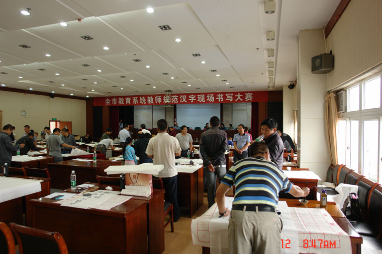 规范汉字书写大赛教师(软笔)现场赛,于2015年9月12日上午8:00在新华大厦六楼讲座厅举行,参加本次比赛的都是来自八县一区中小学以及市直学校经过初赛遴选的优秀选手大赛主题是“唱响中国梦・书写汉字韵”,云南人民出版社市场总监乔跃国,国家一级美术师、 中国书法家协会会员、云南省书法家协会驻会副秘书长张斌,玉溪市教育局副局长吴光连,玉溪市文学艺术界联合会主席,玉溪市书法家协会主席普辉,玉溪市文化局副局长贾来发,玉溪书法家协会副主席兼秘书长戴志,玉溪新华书店总经理史松林,玉溪市教育科学研究所所长矣向阳,玉溪市教育科学研究所副所长吴永林,玉溪市教育局语委办马丽莉等领导光临指导了本次竞赛。书写内容围绕大赛主题,采用自选与规定作品各一幅的要求进行。