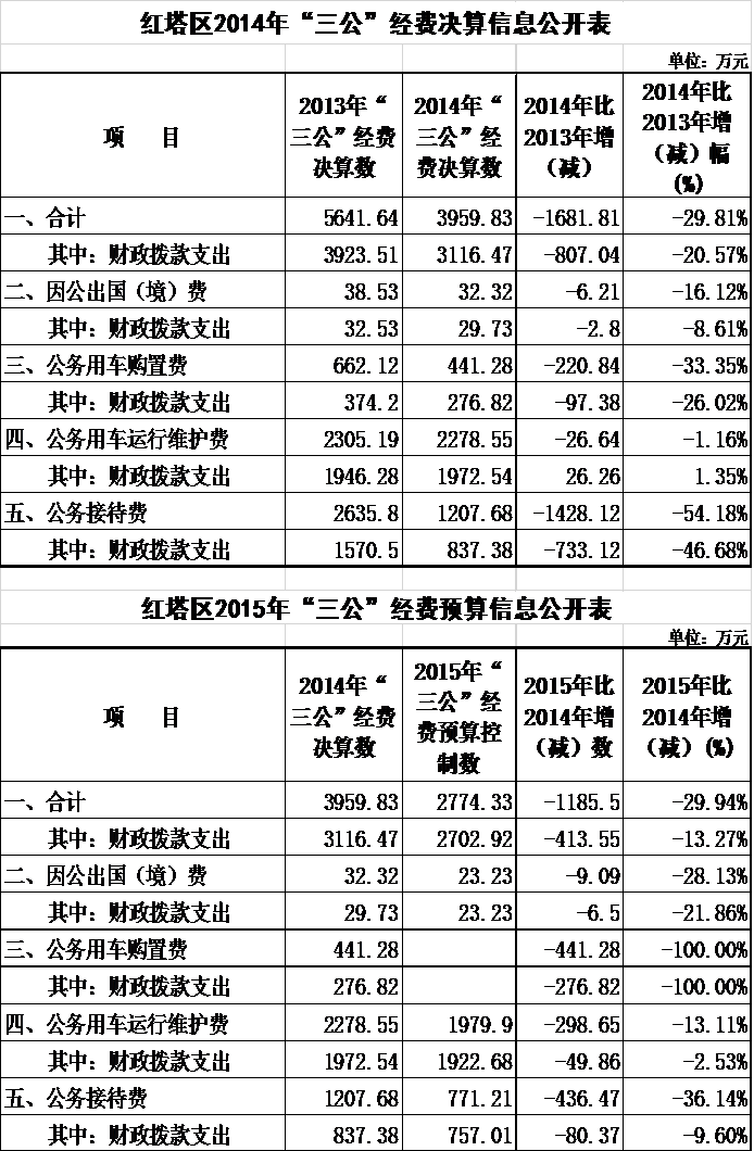 与2014年决算数相比,2015年红塔区 “三公”经费预算减少1185.5万元,下降29.94%:因公出国(境)费减少9.09万元, 下降28.13%;公务用车购置费今年未安排预算;公务用车运行维护费减少298.65万元, 下降13.11%;公务接待费减少436.47万元,下降36.14%。其中,财政拨款预算减少413.55万元,下降13.27%:因公出国(境)费减少6.5万元,下降21.86%;公务用车购置费今年未安排预算;公务用车运行维护费减少49.86万元,下降2.53%;公务接待费减少80.37万元,下降9.6%。