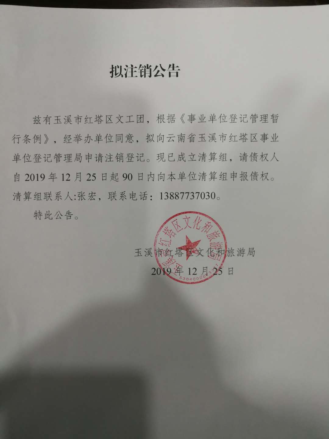 兹有玉溪市红塔区文工团,根据《事业单位登记管理暂行条例》,经举办单位同意,拟向云南省玉溪市红塔区事业单位登记管理局申请注销登记。现已成立清算组,请债权人自2019年12月25日起90日内向本单位清算组申报债权。清算组联系人:张宏,联系电话:13887737030。